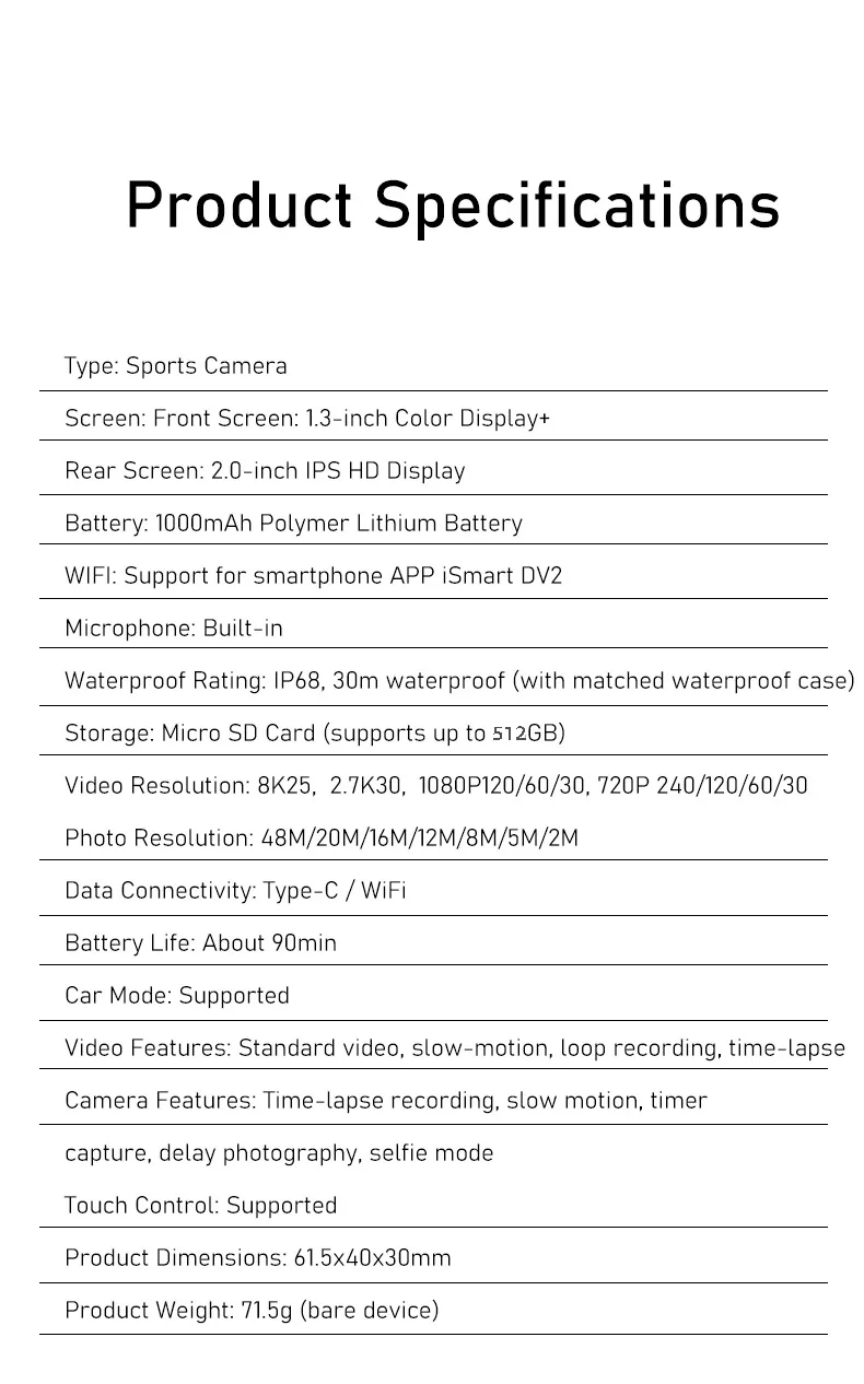 Video resolution: 8K 30FPS/ 6K 30FPS 4K 60fps/ 2.7k 60fps/ 1080P 60fps